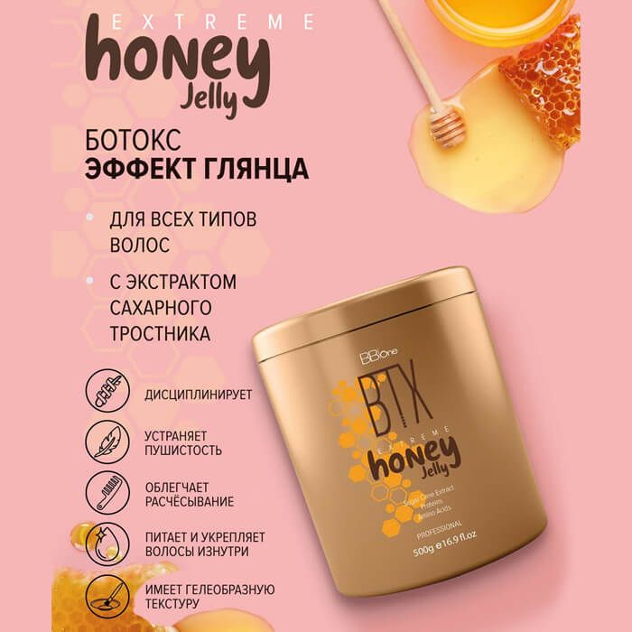 Ботокс для волос BTX Extreme Honey Jelly имеет гелеобразную консистенцию, напоминающую медовое желе. Насыщенный питательными компонентами состав, позволяет восстановить естественный водный баланс внутри каждого волоска, вернуть блеск и мягкость, защитить от ультрафиолетового излучения, устранить пушистость и облегчить расчесывание.