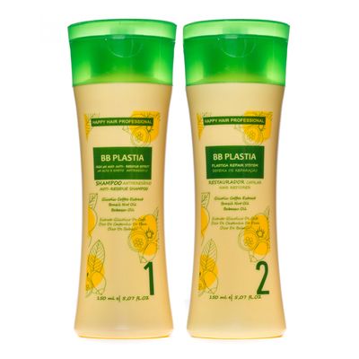 Набор BB Plastia для кератинового выпрямления волос насыщен витаминными добавками, способными возвращать здоровье волос, восстанавливать блеск, создавая глянцевое сияние и увеличивать плотность. Реконструкционная маска позволяет сократить время процедуры и лишена едких химических испарений.
